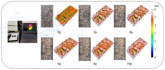 This study employed the Gocator 3110 3D intelligent sensor by LMI, Mississauga ON, Canada, to precisely measure the surface texture of specimens. As shown in Figure 3, the Gocator 3110, featuring binocular stereo vision, was mounted on a horizontal metal bracket. Its X/Y axis scanning interval was set at 0.1 mm, with a vertical resolution of 0.006 mm. After a specimen was placed within the scanning range, the high-precision measurement captured detailed texture information.
