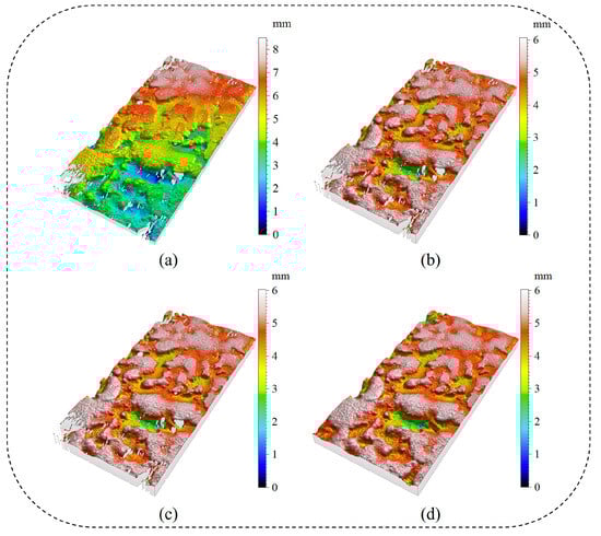 To enhance the accuracy of the raw point cloud data (Figure 4a), three preprocessing steps were implemented: calibration (Figure 4b), denoising (Figure 4c), and completion (Figure 4d), yielding higher-quality data for subsequent feature extraction.