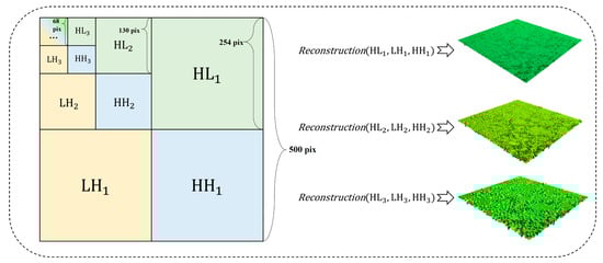where denotes the level. As shown in Figure 5, each decomposition yields a set of low-frequency coefficients and three sets of high-frequency coefficients, representing low-frequency (LL), horizontal high-frequency (HL), vertical high-frequency (LH), and diagonal high-frequency (HH) texture features. The high-frequency information is used to reconstruct sub-textures at different scales. For example, the Level 1 sub-texture is reconstructed using the high-frequency information (denoted by ). As shown in Figure 5, with an increase in the decomposition level, the reconstruction results generally evolve from describing texture details to outlining texture contours.