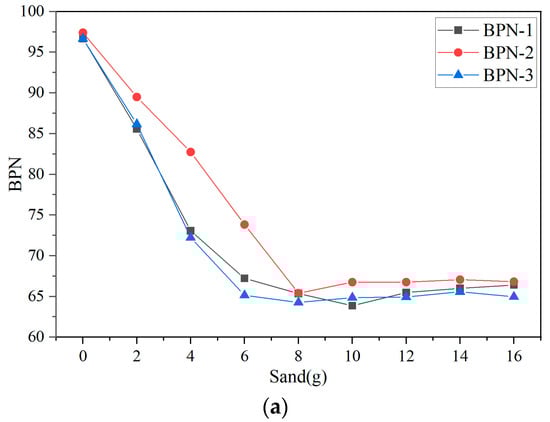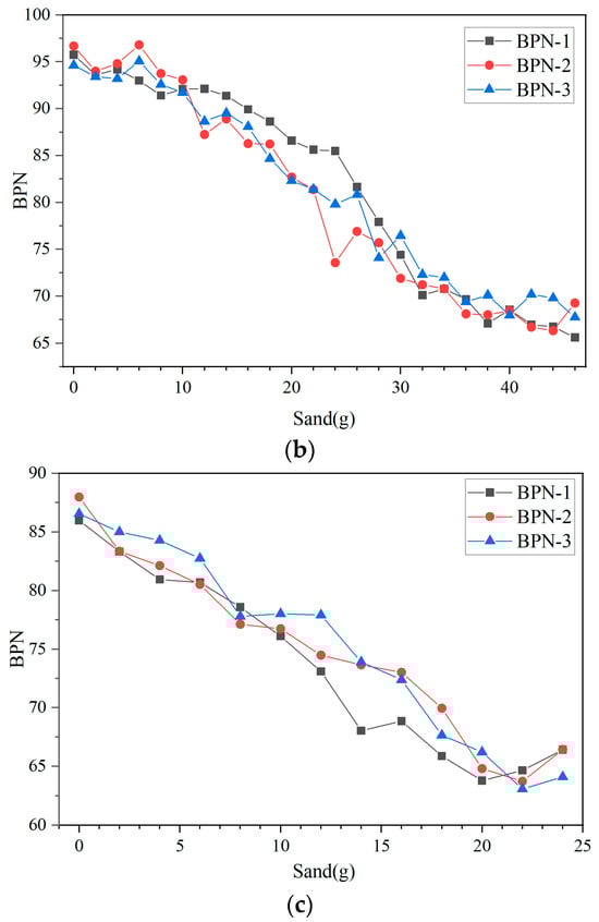 As shown in Figure 6a–c, for AC-13, OGFC-10, and SMA-16, the BPN tended to stabilize once the sand accumulation in the test area reached 8 g (0.4 kg/m2), 38 g (1.9 kg/m2), and 22 g (1.1 kg/m2), respectively. From the data in Figure 6, it can be seen that when the surface began to accumulate sand, the measured BPN on AC-13 dropped sharply. In contrast, for OGFC-10 and SMA-16, the BPN exhibited an initial slow decline, followed by a rapid decrease, and finally stabilized.