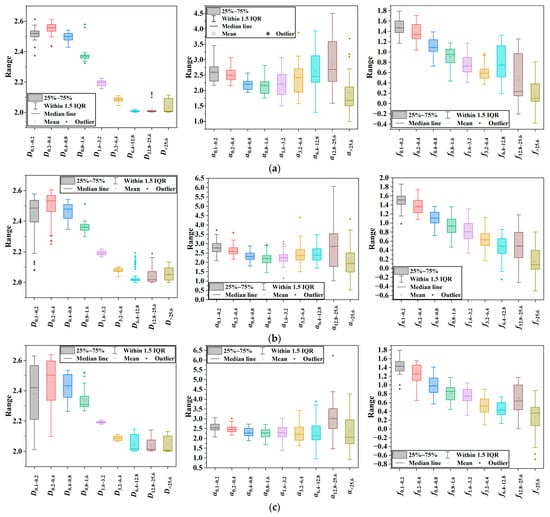 Multifractals, on the other hand, depict the local singularity and inhomogeneity of an object’s surface. This theory offers richer details than fractals. The calculations for the multifractal spectrum are shown in Equation (4):