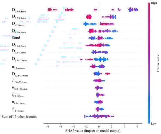 Figure 9 is a scatter plot of SHAP values, visually presenting each feature’s impact on the model output (BPN). Each point represents a sample’s SHAP value, with the color intensity indicating the feature magnitude—red for high values and blue for low. The x-axis shows SHAP values, where positive values increase the prediction and negative ones decrease it. The y-axis lists the features involved in prediction, including , , , , Sand, and the “Sum of 13 other features”. The latter aggregates the SHAP values of less influential features.