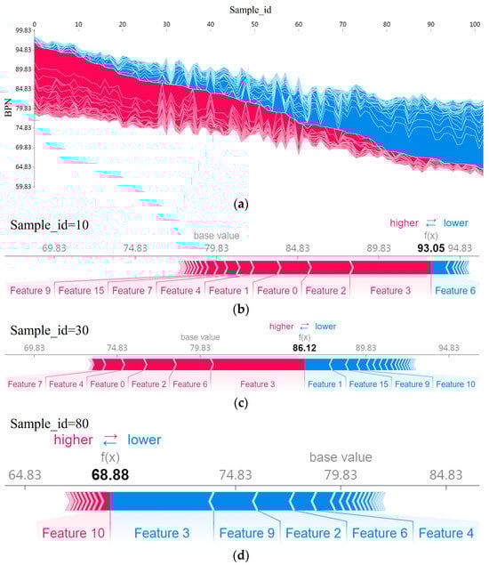 From Figure 10, it is evident that different features dominate in different BPN ranges. Features contributing to higher predictions are more impactful when the BPN is large (Figure 10b). As the BPN decreases (Figure 10c,d), positive contributors diminish while negative ones increase, shown by the color shift from red to blue.