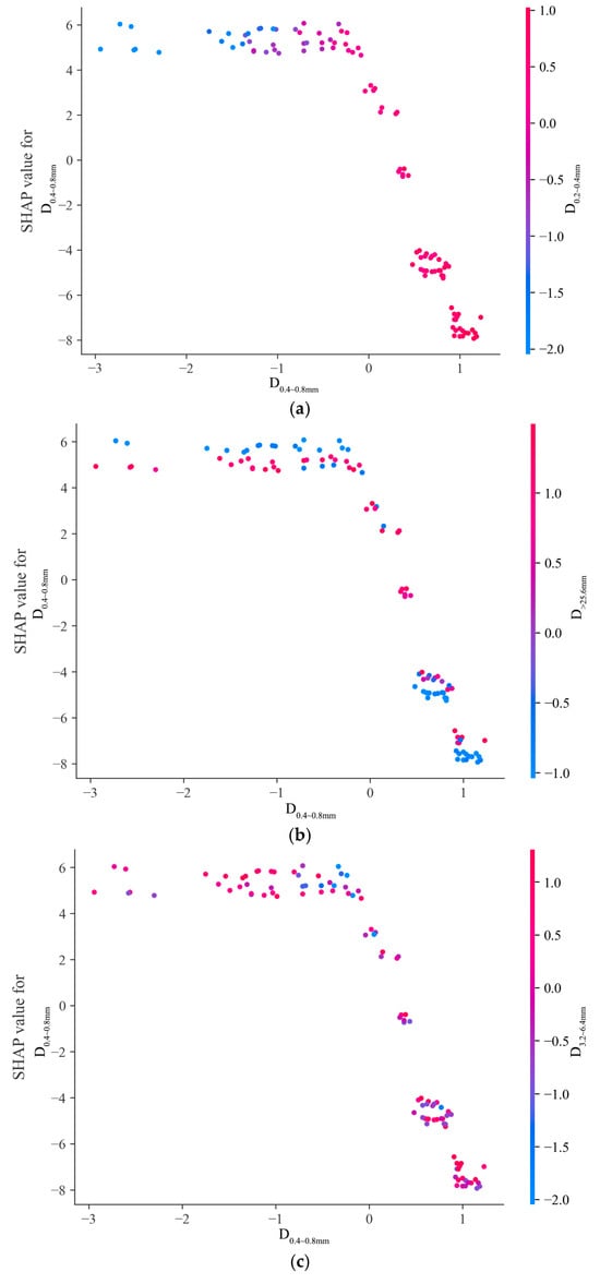 Figure 11b,c depict the interactions of with and , respectively. Changes in and values alter SHAP values, indicating complex impacts. Different value combinations change the direction and strength of ’s impact, showing that the model considers these feature interactions when predicting the BPN.