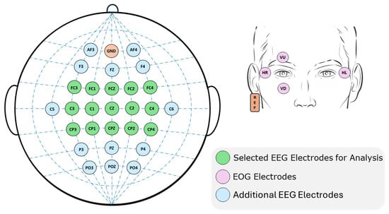 On the left side of the image, the distribution of the electrodes utilized in this research can be observed. The electrodes utilized for signal processing are indicated by a green highlight. Additional electrodes used for EEG signal acquisition are highlighted in blue. The image on the right illustrates the distribution of the EOG electrodes on the faces of the subjects. Two electrodes (VU, VD) are positioned vertically between the eyes to capture blinks. The remaining electrodes (HR, HL) are positioned laterally between the two eyes to capture horizontal movements. On the right ear, a reference (highlighted in orange) is positioned as a clamp.