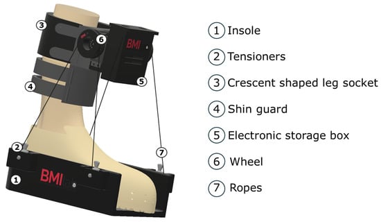 The second part of the device is positioned over the subject’s shin and consists of a crescent-shaped piece that connects to a kind of shin guard using a ratchet closure. This element is the grey-colored piece that can be seen again in Figure 2. The electronic storage box of the device is attached to this latter part via a T-shaped union. In this section, two servo motors are located, each at one end. Each servo motor is equipped with two wheels, which are connected via four ropes to the four grip points on the insole. A dorsal flexion movement is generated when the movement of the wheels lifts the front part of the insole. Conversely, when the movement of the wheels creates tension on the back of the insole, it forces the subject to perform a plantar flexion.