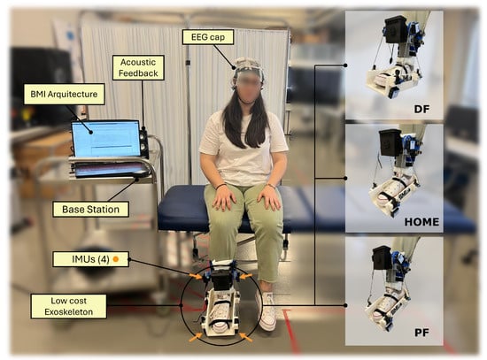 - Polo-Hortigüela, C.; Juan, J.V.; Ortiz, M.; Iañez, E.; Azorín, J.M. Análisis de señales EEG en movimientos de flexión plantar y dorsal mediante el empleo de un exoesqueleto de bajo coste para la caracterización de la acción motora. In Proceedings of the XLI Congreso Anual de la Sociedad Española de Ingeniería Biomédica, Cartagena, Colombia, 22–24 November 2023; pp. 381–384. [Google Scholar]