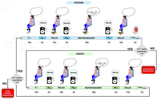 This image shows the protocol followed in the open-loop tests of this research. The blue color shows the order and duration of motion trials. The same but in green for the static trials. The only difference between the two types of trials is that after the H Infinity period, the exoskeleton performs cyclic movements of PF and DF only in motion trials. Motion and static trials alternate until 11 of each are completed. All mental tasks are preceded by an auditory cue in the form of a voice.