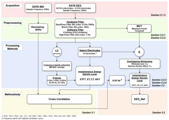 This figure describes a general outline of the working process of this research. The study starts with the acquisition of data by performing six experimental tests. After that, the signal is de-artifacted by using hardware filters and software. For signal processing, the different frequency-time transforms are used. The purpose of all this is to obtain the Instantaneous Energy Density Level. Prior to this, a standardization of the frequency bands to be used is carried out. Finally, the two lines of research are proposed. On the one hand, we study the analysis of the correlation between the position of the foot and the EEG signal. On the other hand, we perform decoding of the motor imagination. For the first study, only the motion model data as well as the unnormalized data are used. For the second study, the normalized data as well as the data from both the motion and static trials are used.