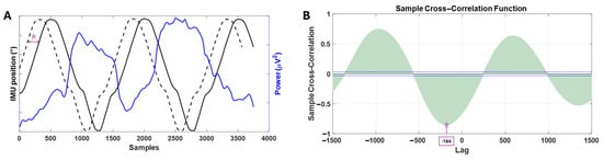 Three signals can be seen in Figure 6A. The blue signal represents the instantaneous energy variation for a section of the test. The black continuous signal illustrates the position of the exoskeleton during the same section. The black dashed signal represents the IMU signal advanced the same number of samples corresponding to the phase shift where the maximum correlation value is found. Figure 6B shows the cross-correlation result at different lags.
