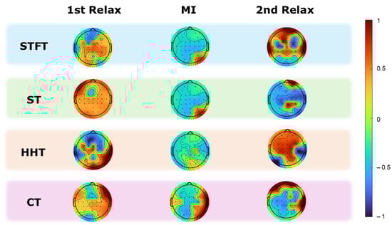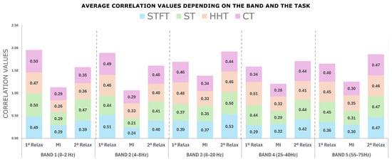 In order to obtain a global metric of the correlation values for the fifteen selected electrodes, the absolute average is calculated per subject, per frequency band, and per segment. This analysis will differentiate the correlation behavior based on the relaxation and motor imagery segments as well as the five studied frequency bands. The frequency band that shows the highest average value among the four time-frequency transforms employed will be used to calculate the variation of instantaneous energy in the feature extraction described in Section 3.2.