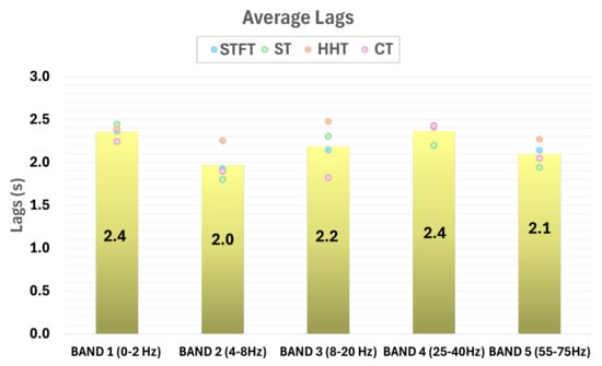 To determine the average lag values where the highest correlation values occur, an average is calculated, and the values are averaged for the three segments in each band. This final step will provide the average lags for each frequency band.