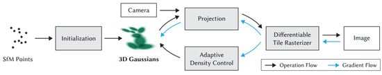 - Kerbl, B.; Kopanas, G.; Leimkuehler, T.; Drettakis, G. 3D Gaussian Splatting for Real-Time Radiance Field Rendering. ACM Trans. Graph. 2023, 42, 1–14. [Google Scholar] [CrossRef]