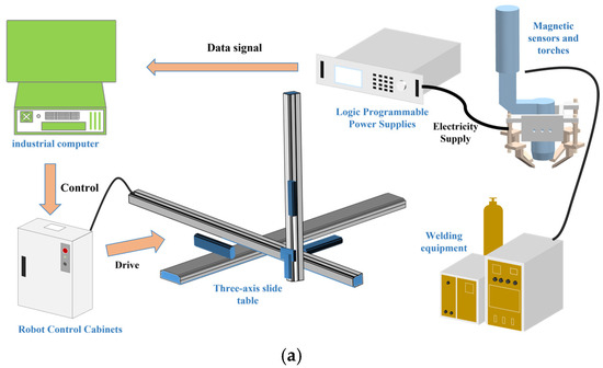 As illustrated in Figure 1, the multi-source signal fusion test platform consists of four primary modules: a multi-pole magnetic control arc system, a robot motion control system, a plasma welding machine, and a signal acquisition system. The multi-pole magnetic control arc system generates an alternating magnetic field to control the arc oscillation and collect the corresponding arc signals. This system consists of a variable-frequency power source, known as the HY-LCS2P, manufactured by Hangyu Company (Beijing, China), and four symmetrical magnetic poles. The welding power was provided by a Tetrix 452 Synergic precision plasma welder from EWM, Dortmund, Germany. Hall sensors (CHV-50VD, Sensor Electronics Company, Beijing, China) and pressure sensors (cantilever type, VH130,Viste, Shenzhen, China) were then utilized to collect arc voltage and pressure signals. The motion control system is comprised of a control cabinet and a three-axis sliding table (model JD45C, manufactured by the Shanghai Aluminum Company of Shanghai, China). The arc morphology and molten pool observations were performed using a high-speed camera (model Aguteye, manufactured by Ketianjian, Changsha, China) that samples at 500 frames per second with a resolution of 640 × 512. The system integration is illustrated in Figure 2.