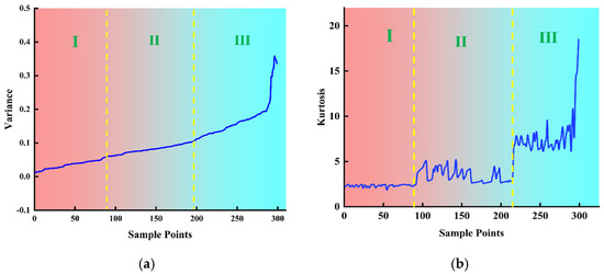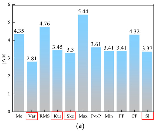 Comprehensive GRA and PCC combination analysis (GPCC) takes into account the correlation between each feature and the ensuing outcomes, as well as the replicability across various feature types. Extraction of the features of these two signals was facilitated utilizing downscaling and dimensional extraction techniques. This approach rendered the trend of melting penetration more discernible. The parameters of the arc signal and the pressure signal were ascertained, as illustrated in Figure 12 and Figure 13. It was observed that features 1–80 remained unmelted, features 81–180 underwent complete melting, and features 181–256 were characterized by overfusing, The arc signal characteristics of fusion detection ability in descending order are variance, kurtosis, skewness, and slope, and the arc pressure signal characteristics of fusion detection ability in descending order are variance, kurtosis, slope, 50 Hz amplitude, and 150 Hz amplitude.