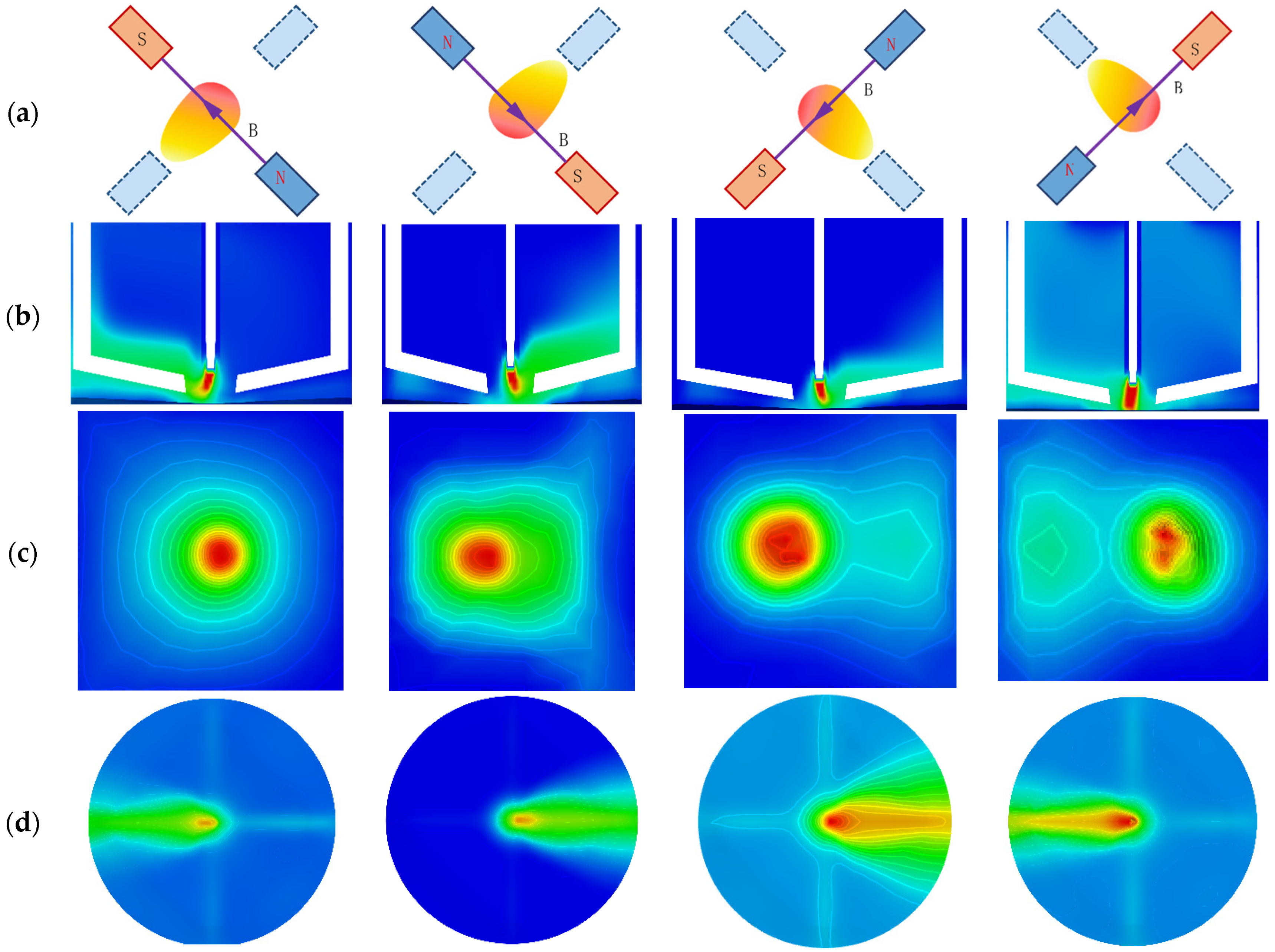 - Meng, X.; Bachmann, M.; Artinov, A.; Rethmeier, M. The influence of magnetic field orientation on metal mixing in electromagnetic stirring enhanced wire feed laser beam welding. J. Mech. Work. Technol. 2021, 294, 117135. [Google Scholar] [CrossRef]