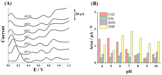 (A) Simultaneous measurements of 25.0 mg L−1 UAC, SAL, SMX, and TMP by DPV in Britton–Robinson buffer solution at different pH values. (B) Plot of the oxidation peak area of each analyte at different pH values.