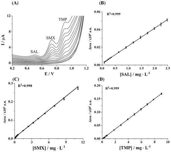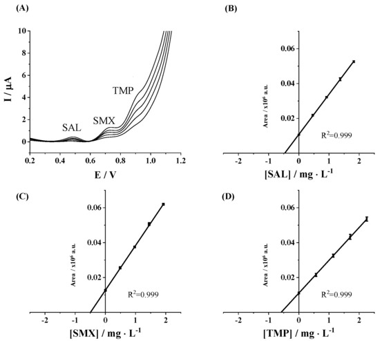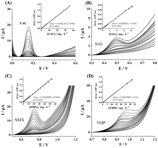 The electrochemical performance of the SPCE for the individual determination of UAC, SAL, SMX, and TMP was evaluated by determining the sensitivity, R2, linear range, limit of detection (LOD), and limit of quantification (LOQ). Firstly, DPV current responses of individual target pharmaceuticals were recorded at increasing concentrations, namely, 0.07–35.7 mg L−1, 0.01–8.3 mg L−1, 0.1–57.3 mg L−1, and 0.2–32.5 mg L−1 for UAC, SAL, SMX, and TMP, respectively. As can be seen in Figure 2A–D, well-defined oxidation peaks over the analyzed concentration ranges were obtained for all considered pharmaceutical compounds. Good linear responses of peak area vs. target compound concentration were achieved for all tested pharmaceutical compounds (Figure 2A–D insets). The analytical performance for the individual determination of target analytes is summarized in Table 1. Sensitivity was computed as the slope of the regression line. LOD and LOQ values were calculated by using International Union of Pure and Applied Chemistry (IUPAC) definitions, considering LOD as 3Sa/b and LOQ = 10 Sa/b, where Sa is the standard deviation of the intercept and b is the slope of the calibration straight line in the considered concentration range. The linear range is given between the achieved LOQ and the upper concentration for which suitable linearity has been demonstrated. As can be observed from Table 1, LOD values are in the range of 67.0 to 235.1 µg L−1 depending on the studied pharmaceutical compound, and linear responses up to 35.7, 8.3, 53.8, and 32.5 µg L−1 were attained for UAC, SAL, SMX, and TMP, respectively. Common concentrations of these analytes in environmental water sources are in the lower range of 1–250 µg·L−1, reaching values up to 1000 µg L−1 for SAL [30,31].