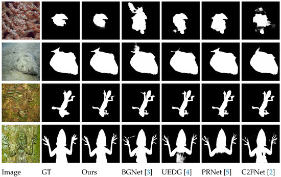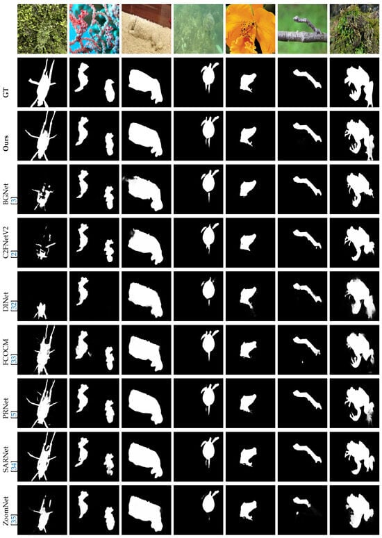 Figure 5 presents a systematic comparison of the proposed ATDMNet against seven SOTA camouflaged object detection (COD) algorithms across several scenarios featuring multiple camouflaged items, ranging from Column 1 (Lizard) to Column 7 (Frog). Quantitative assessments indicate that current methodologies, such as BGNet [3], C2FNetV2 [2], and DINet [32], demonstrate considerable deficiencies in identifying low-contrast camouflaged objects. As an illustration, these approaches exhibit insufficient segmentation of the camouflaged lizard in Column 1, with significant false positives (e.g., erroneously categorizing background textures as feline characteristics). This boost in performance arises from ATDMNet’s hierarchical multiscale fusion design, which incorporates cross-scale attention methods to increase discriminative feature representation.