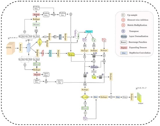 The output is generated. Initially, the dimensions of are modified. If , carry out bilinear interpolation and upsampling on V and incorporate deep convolution into V to augment local features. Ultimately, execute linear projection. MHA enhances the model’s sensitivity to local features through the integration of agent nodes and promotes efficient information flow using a bidirectional attention mechanism.