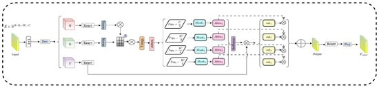 Our ATDM is constructed on a multi-head self-attention fusion agent to minimize computation, specifically multi-head self-attention (MHSA). Let , where H and W signify height and width, respectively, and C denotes the number of channels. The equation for MHSA is as follows: