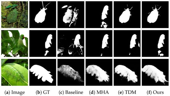 As illustrated in Figure 6d, the incorporation of MHA results in a transformation of the caterpillar limb outlines from indistinct (Baseline) to distinct, while simultaneously diminishing the false detection regions of analogous textures (e.g., leaf textures) in the background, attributable to the amplification of local features by the MHA’s agent nodes. As illustrated in Figure 6e, the incorporation of TDM transforms the parrot trunk area from fragmented (Baseline) to intact, while the interference response of the leaf backdrop diminishes (MAE falls by 0.002) due to TDM’s integration of multiscale characteristics via dynamic masks. As illustrated in Figure 6e, the comprehensive model facilitates the more precise segmentation of the transition zone between insect transparent wings and the backdrop, achieving a of 0.915.