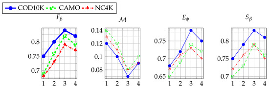 Evaluation Metrics: To assess the initial three tasks, we employ the subsequent metrics: The mean absolute error (MAE) adaptive F-measure () [28], mean E-measure () [29], and structure measure () [30] are referenced in [31]. Reduced values of M and elevated values of , , and signify superior performance.