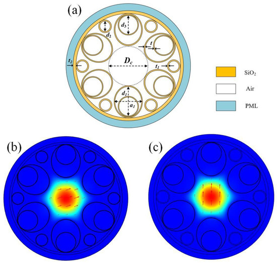 Figure 1a shows the cross-section of the HC-ARF structure with the number of cladding tubes N = 6, and each cladding tube contains one small circular cladding tube and one elliptical tube nested within a large circular cladding tube. The core diameter is Dc, the elliptical cladding tube has a long axis of d1 and a short axis of a1, the diameter of the large circular cladding tubes is d3, the diameter of the small circular cladding tubes is d2, the thickness of the elliptical and large circular cladding tubes is t, the thickness of the small circular cladding tubes is t1, and the thickness of the cladding layer is t2. The outermost layer is a perfectly matched layer (PML), typically set to be 2–3 times the wavelength. Both the cladding tubes and the cladding layer are silica, whose refractive index is wavelength-dependent and can be calculated using the Sellmeier equation [15].
