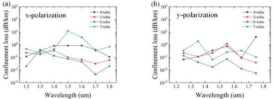 The effects of the number of cladding tubes N, as the most important parameter, on the confinement loss are studied first. Based on the practical application requirements, the initial data are set as follows: Dc = 50 µm, d1= 40 μm, a1 = 35 μm, d2 = 14 μm, d3 = 24 μm, t = 0.5 μm, t1 = 1 μm, and t2 = 1.3 μm. The variation of the confinement loss as a function of the wavelength with different numbers of cladding tubes N = 4, 5, 6, and 7 for x and y polarizations is shown in Figure 2. It can be seen that the overall confinement loss is lowest for N = 6. This is mainly because the greater the number of cladding tubes, the stronger the ability to confine the light, which has lower confinement loss [19]. However, it is not the greater the number, the lower the confinement loss. The reason is that with the increase of N, the cladding tube gap will decrease, which can strengthen the resonance between the cladding tubes and cause increased confinement loss. Therefore, in the subsequent analysis, the number of cladding tubes N = 6 is adopted, as shown in Figure 1a.