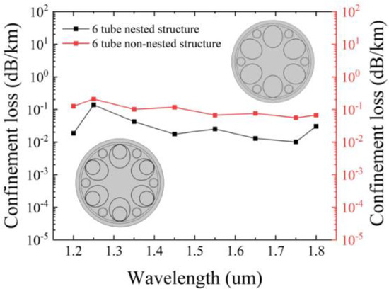The reason why the nested cladding tubes are selected can be observed from Figure 3, which illustrates the variation of confinement loss with the nested and non-nested structures. It is evident that the nested tube structure exhibits lower confinement loss compared to the non-nested tube structure. It is easily understandable that adding nested tubes can effectively reduce the adverse effects caused by the gaps between the tubes, thereby increasing the ability to constrain light.