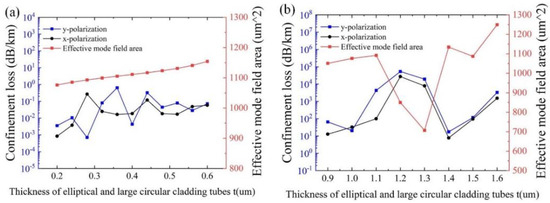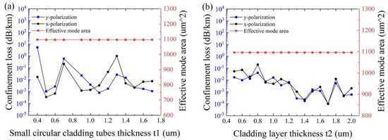 Figure 6a,b show the influence of the thickness of small circular cladding tubes t1 and the cladding layer t2, with other initial parameters remaining unchanged, respectively. As can be seen from Figure 6a, the minimum confinement loss of 2.85 × 10−4 dB/km is obtained at t1 = 0.5 μm, and the effective mode area almost keeps stabilizing at ~1100 μm2. As shown in Figure 6b, the effects of the thickness of the cladding layer t2 on the effective mode area are negligible. The variation of the thickness of the cladding layer t2 has less impact on the confinement loss than that of the thickness of the elliptical and large circular cladding tubes t and the small circular cladding tubes t1. This is because the farther the distance from the core, the smaller the impact on the core mode. In particular, the minimum confinement loss of 1.03 × 10−4 dB/km is realized at t2 =1.7 μm for both polarizations. Therefore, it is reasonable to set t1 = 0.5 μm and t2 = 1.7 μm.
