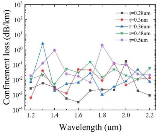 To determine the optimal value of t, the confinement loss as a function of the wavelength for different t, with other initial parameters remaining unchanged, is shown in Figure 5. It can be seen that for t = 0.28 μm, the lowest loss of 2.79 × 10−4 dB/km is achieved at λ = 1450 nm, and the overall loss is below 0.39 dB/km. When t = 0.3 μm, the lowest loss of 6.45 × 10−4 dB/km is obtained at λ = 1200 nm with the overall loss below 0.13 dB/km. For t = 0.36 μm, the lowest loss of 9.43 × 10−4 dB/km is reached at λ = 1250 nm, with the overall loss below 3.09 dB/km. When t = 0.48 μm, the lowest loss of 3.8 × 10−3 dB/km is obtained at λ = 2150 nm, with the overall loss below 0.16 dB/km. For t = 0.5 μm, the lowest loss is 6.85 × 10−3 dB/km at λ = 1700 nm, with the overall loss below 2.04 dB/km. The comparison indicates that the lowest confinement loss can be achieved at t = 0.3 μm. As a consequence, the optimal t is determined to be 0.3 μm.