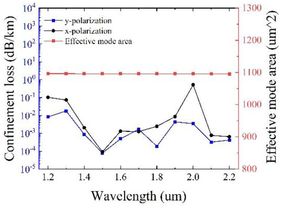 Figure 7 presents the confinement loss and the effective mode area as a function of the wavelength with optimized tube thickness t, t1 and t2 and other initial parameters remain unchanged. It can be observed that in the transmission band of 1000 nm, the confinement loss can reach the minimum value of 7.91 × 10−5 dB/km at 1500 nm, with a large effective mode area of 1096.3 μm2 simultaneously. It should be pointed out that the maximum confinement loss of y polarization is less than 0.018 dB/km, illustrating the excellent performance of low confinement loss.