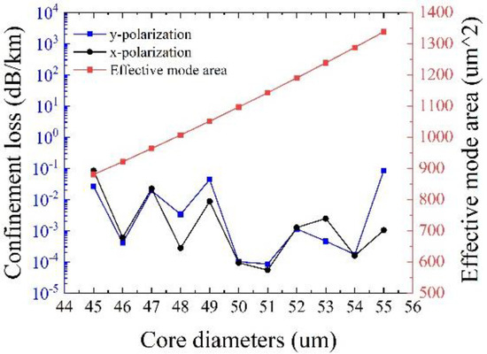 Variation of confinement loss and effective mode area with different core diameters.