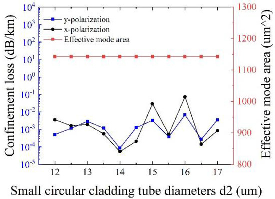 Figure 9 depicts the influences of the diameter of small circular cladding tubes d2 on the confinement loss and the effective mode area at λ = 1550 nm, with other initial parameters remaining unchanged. It is clear that the effects of d2 on the effective mode area can be neglected, and the maximum confinement loss is less than 0.1 dB/km. Especially, the minimum confinement loss of 5.42 × 10−5 dB/km for x-polarization and 8.48 × 10−5 dB/km for y-polarization can be realized at d2 = 14 μm with an effective mode area of 1142.5 μm2, demonstrating the realization of ultralow loss and large effective mode area at the same time. Therefore, the optimal value of d2 is 14 μm.