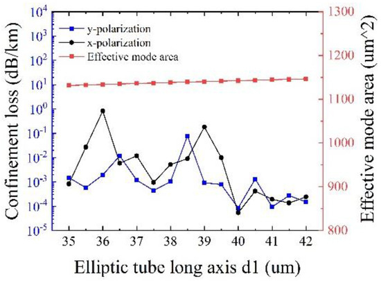 Figure 10 shows the effects of the long axis of the elliptical cladding tube d1 on the confinement loss and the effective mode area at λ = 1550 nm, with other initial parameters remaining unchanged. It can be seen that the effective mode area slightly increases with d1, and the minimum confinement loss of 5.42 × 10−5 dB/km is obtained at d1 = 40 μm for both polarizations, with an effective mode area of 1142.5 μm2. It is easier to understand that the increase of d1 can lead to easy mode coupling from the core to the cladding, thereby to increase the effective mode area. Hence, the optimized d1 is determined to be 40 μm.