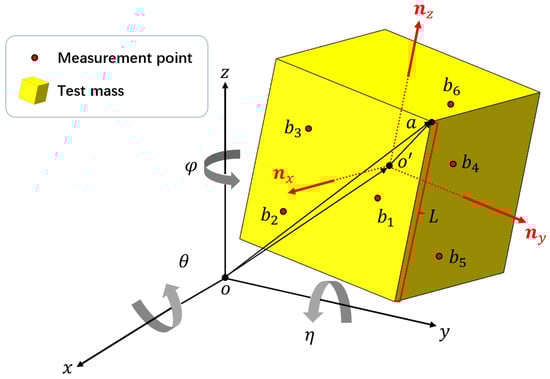 Since the TM can be approximated as a cube, its 6-DoFs can be represented by the vector . A fixed coordinate system is shown in Figure 1, the origin coincides with the geometric center of the TM in its initial state, and the three axes are perpendicular to the three planes of the TM in its initial state. The coordinates represent the translational DoFs of the TM center deviated from the origin, while represent the rotational DoFs along the x-, y-, and z-axes. Our method involves measuring the positions of six points on the surfaces of the TM to establish a system of six equations. The 6-DoFs of the TM can then be obtained by solving this system of equations. The measurement equation is constructed as follows. Define the roll–pitch–yaw matrix: