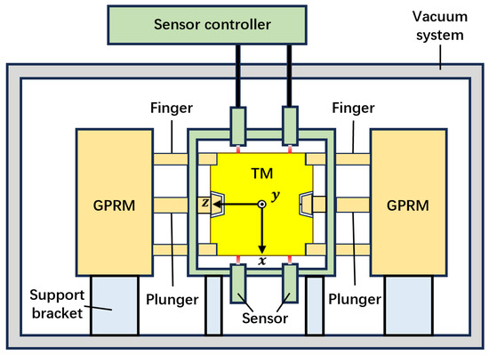 The schematic diagram of the apparatus structure. The sensing system (green) can read out the displacement data from the motion of the TM (yellow) after release; the GPRM (orange) can grab and release the TM from both sides by its fingers and plungers; the whole testing apparatus should be placed and fixed by support brackets (blue) inside a vacuum environment provided by the vacuum system (grey).