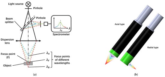 Spectral confocal displacement sensor. (a) The schematic diagram of the spectral confocal displacement sensor. (b) Two types of the spectral confocal displacement sensor.