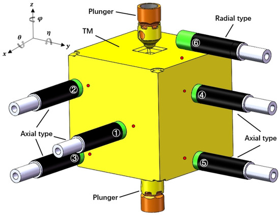 Subsequently, the 6-DoFs of the TM must be derived from the six displacement measuring data due to the fact that the measurement points, denoted by , are located on the TM’s surface. As a result, the vectors are vertical with respect to the corresponding normal vectors of the TM’s surfaces: