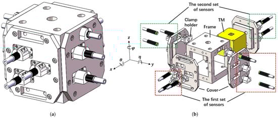 - Sensing system: This system acquired displacement data from the TM motion following its release and translated it into the TM’s 6-DoF format using a methodology previously described. It comprised a frame; four specific covers for mounting displacement sensors; and two sets of these sensors, each comprising six sensors.
