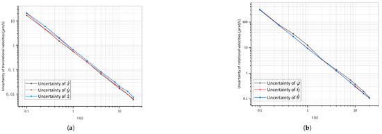 To determine the optimal test time for achieving the desired velocity measurement accuracy, we investigated the impact of different test times on the 6-DoF velocity deviation from the exact value (Figure 7). Over a quarter of a second test time, the accuracy of the translational and rotational velocities reached the order of the initial velocity. For accurate and stable measurements, a test time of 4 s was suggested, whose accuracy of the translational and rotational velocities was two orders of magnitude smaller than the initial velocity required in Table 1.