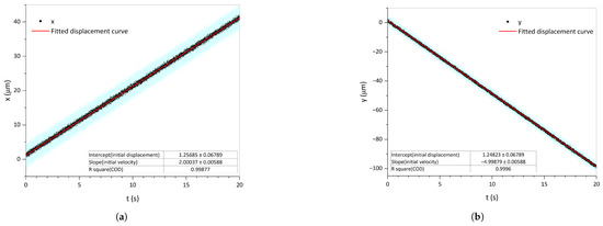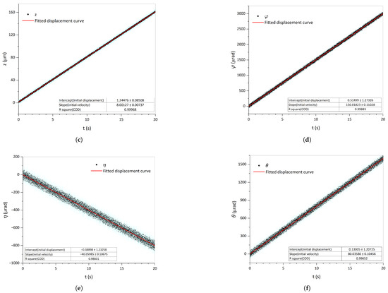 The initial 6-DoF velocities of the TM can be obtained through linear fitting of the displacement data. This is predicated on the assumption that the TM is not subject to external forces and that the interference term is injected during the Monte Carlo simulation. The displacement sensor employed in this study had a sampling rate of 400 Hz, and the calculation of the 6-DoF displacements at each sampling time was facilitated by Equation (4). The 6-DoF velocities can be obtained by linear fitting of the displacement data: