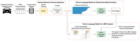 In this study, we proposed a novel method to enhance the explainability of an in-vehicle CAN intrusion detection model by integrating a VLM with LIME analysis. Among various predictive models evaluated, the ML model that exhibited the best performance on the given vehicle CAN dataset was selected for further analysis. To capture both global and local interpretability, we first utilized the VLM to generate textual descriptions of global feature importance. Subsequently, these global features were incorporated as prior knowledge to guide the VLM in producing instance-level explanations based on LIME analysis, offering detailed insights into the model’s decision-making process.