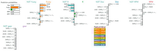The proposed method classifies CAN messages into five categories—Normal, DoS, Fuzzy, Gear, and revolutions per minute (RPM), as detailed in Table 4. The Normal category indicates standard CAN operations without malicious interference. The DoS attacks involve injection of messages with the CAN ID ‘0000’ at 0.3-millisecond intervals, overwhelming the CAN bus. Fuzzy attacks introduce random CAN IDs and payloads at 0.5-millisecond intervals, causing erratic system behavior. Gear attacks target gear-related CAN IDs by injecting messages at 1-millisecond intervals, leading to incorrect gear display on the dashboard. Similarly, RPM attacks manipulate engine RPM-related CAN IDs, also injected at 1-millisecond intervals, resulting in inaccurate RPM readings. In this study, we used a sampled subset of the dataset to reduce the computational cost while preserving the overall data distribution. The dataset comprises 701,832 Normal samples, 29,501 DoS attack samples, 24,624 Fuzzy attack samples, 29,944 Gear samples, and 32,539 RPM samples. It provides a diverse and balanced foundation for evaluating the performance of the proposed intrusion detection model. However, a class imbalance exists across the categories. While we acknowledge the presence of this imbalance, this study primarily focused on enhancing model interpretability and transparency rather than maximizing classification performance. Therefore, techniques to mitigate class imbalance, such as oversampling [43] and class balancing [44], were not applied in this study. For future work, we plan to explore methods such as the synthetic minority oversampling technique (SMOTE) [45] and class-weighted loss functions [44] to further improve classification performance and strengthen the reliability of interpretability under imbalanced conditions.