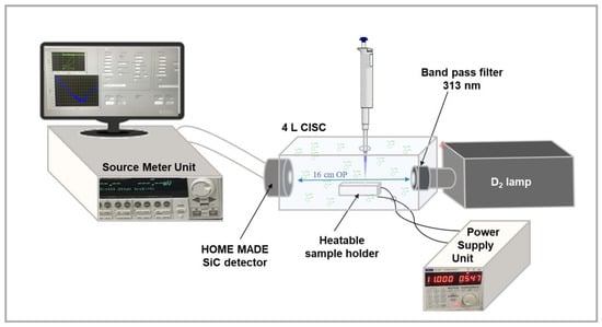 For the laboratory sensing system test, MeSA vapor and MeJA vapor were adopted. Vapor formation was carried out inside a properly modified polypropylene box exploited as a Chemically Interactive System Chamber (CISC) with a 4 L volume and optical path (OP) of 16 cm and using a heatable sample holder. The optical system adopted for the tests consists of a bench deuterium lamp SP-ASBN-D130, equipped with a 10MLF10-313 Mercury Line Bandpass Filter with a FWHM of 11 ± 3 nm, and the homemade low-noise and visible-blind SiC UV detector, which faced each other at the ends of the CISC. A computer remotely connected to Source Meter Unit (SMU) Keithley 2636B (Keithley Instruments, Cleveland, OH, USA) was used to bias the SiC detector (CNR-IMM HQ facilities, Catania, Italy) at a fixed negative voltage and to read a related photocurrent in the range of pA. The intensity current values of the UV photodetector were monitored by using appropriate software developed in LabView. To heat the sample, and thus obtain the MeSA vapor, a holder plate was assembled using an aluminum slab containing a 20 Ohm armored resistor with a power dissipation of 25 W operated by a TTi QL355P power supply unit (Thurlby Thandar Instruments Ltd., Huntingdon, UK). The assembled heatable plate was calibrated using a thermocouple to obtain the curve of temperature versus resistor voltage, not reported for brevity. Some tests were performed without heating the sample. A schematic representation of the entire system is depicted in Figure 1.