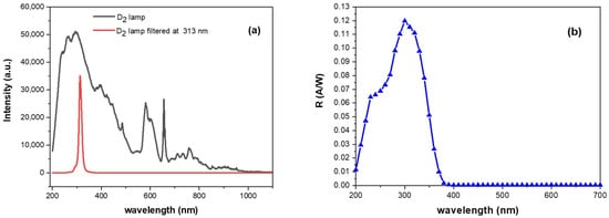 (a) Overlapping spectral profiles of deuterium lamp with 313 nm filter (red line) and without (black line). (b) Responsivity spectrum of SiC photodetector at 10 V reverse polarization.