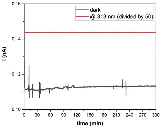 Moreover, a stability test of the entire system was performed both at room temperature and by heating the plate of the sample holder, in the presence of air in the CISC. The trend of the SiC diode photocurrent I was monitored for 300 min, in dark and in UV-light conditions. No appreciable differences in terms of current variations between the two operative temperatures (room temperature and with the heating plate at 72 °C) were registered. For simplicity, in Figure 3, the registered current signals I acquired at room temperature, in dark and in light conditions are reported, which show that the lamp, as well as the detector, are stable for the entire duration of the stability test: a reasonable electrical noise in the range of few pA is observable in the photodetector current due to absence of electrical shielding of the experimental setup.