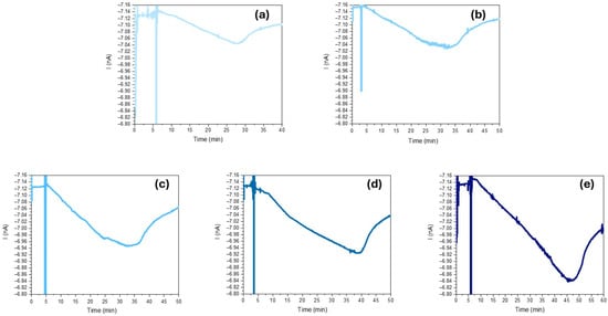 Intensity current trend vs. time observed at increasing MeSA concentration (mol/L): (a) 2.94 × 10−7 M, (b) 9.64 × 10−7 M, (c) 1.93 × 10−6 M, (d) 2.71 × 10−6 M, and (e) 3.86 × 10−6 M.