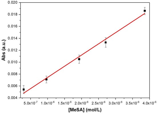 The linear fit of the data plotted in Figure 5 yielded a R2 = 0.992, demonstrating a strong agreement with theoretical predictions. A small non-zero intercept was observed in the calibration curve despite the use of precisely known MeSA concentrations. This deviation is a common occurrence in spectrophotometric methods, and, in our specific case, it could stem from stray light, matrix effects and/or statistical variation inherent to the measurements.